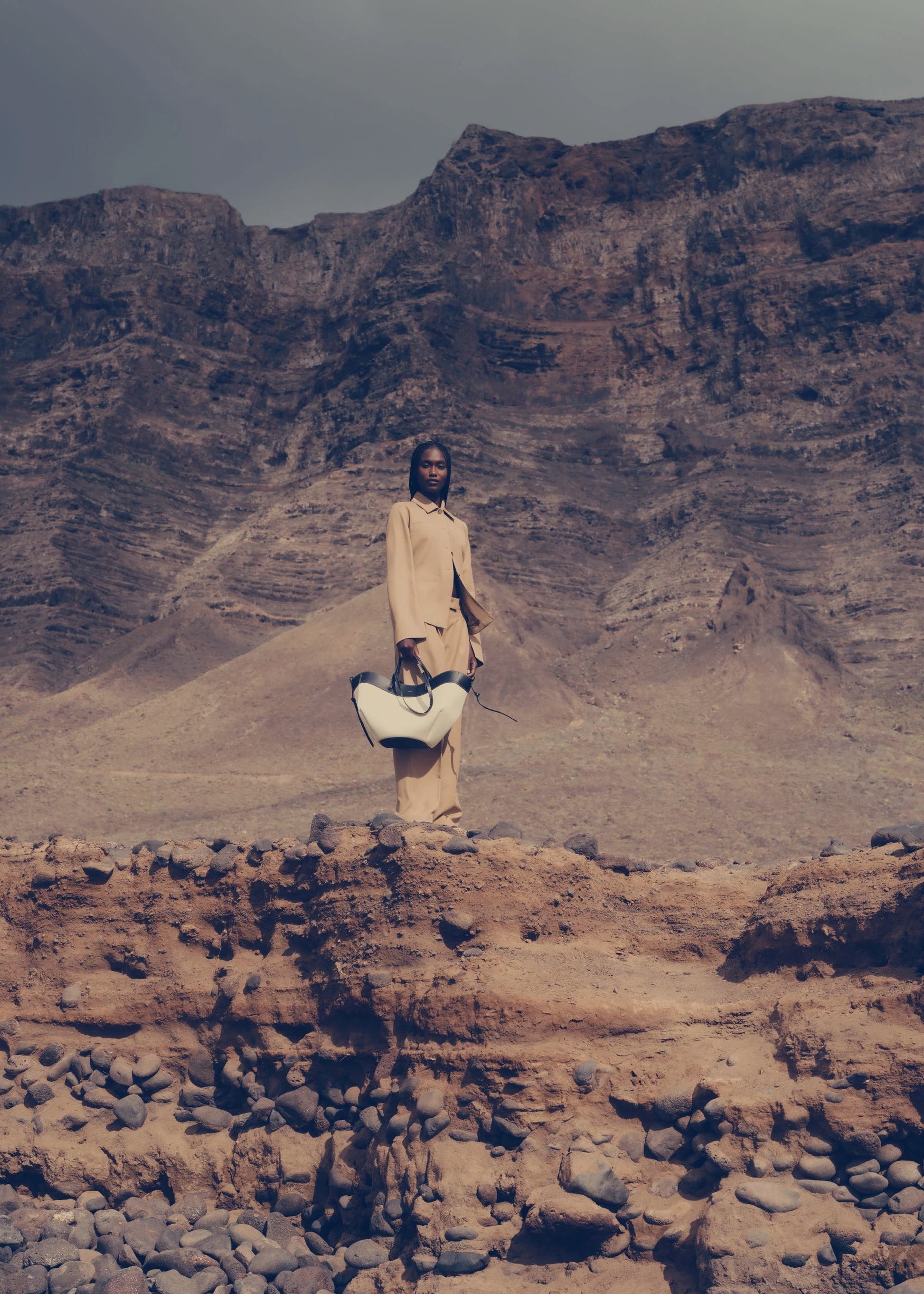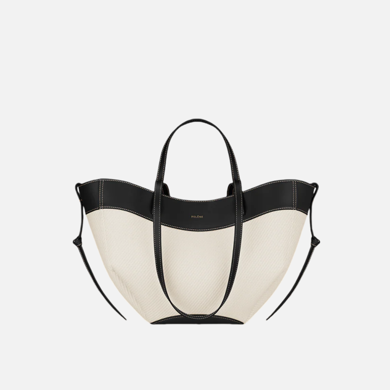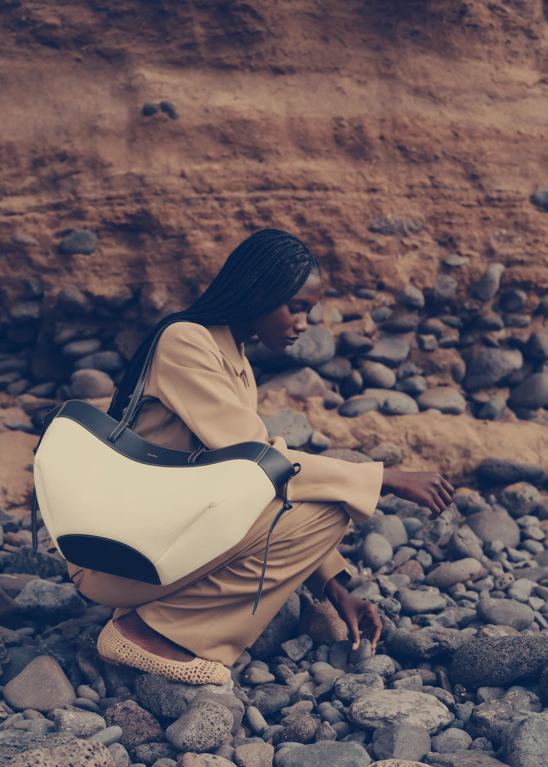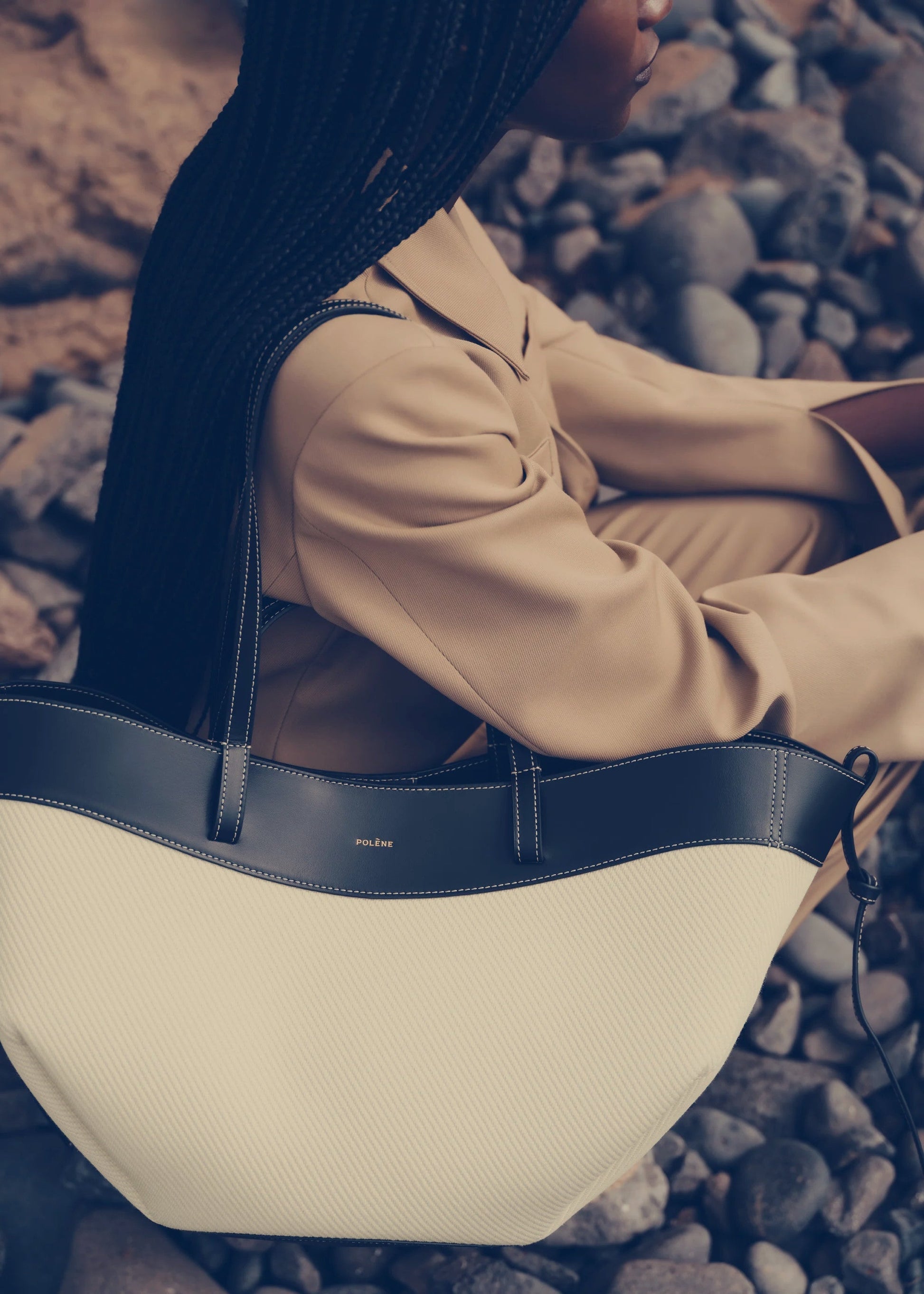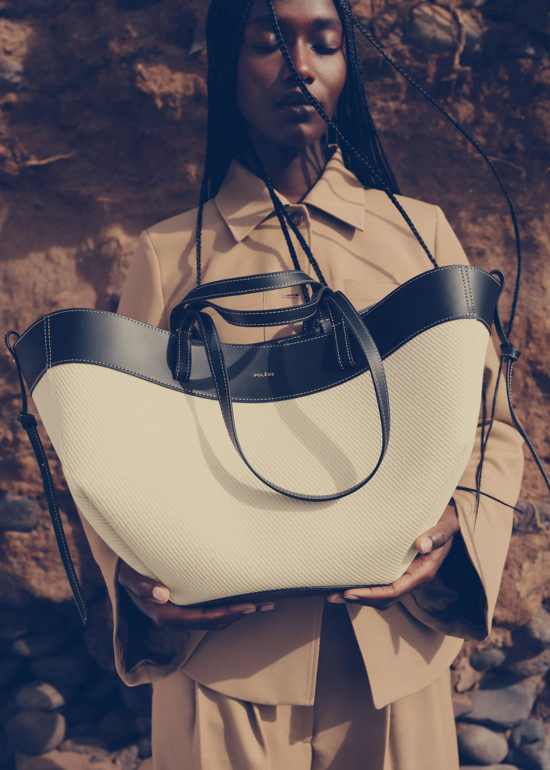 This sculptured tote bag featuring waves, folds, and curves can be used in two ways. Basket-style, with its sides open and straps on the outside, or As a flower-like closed bag, with its sides tucked in and its straps crossed on the inside.