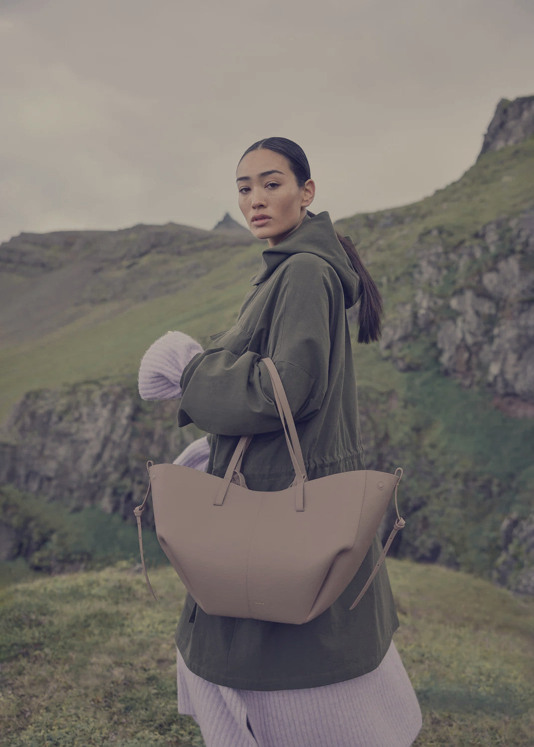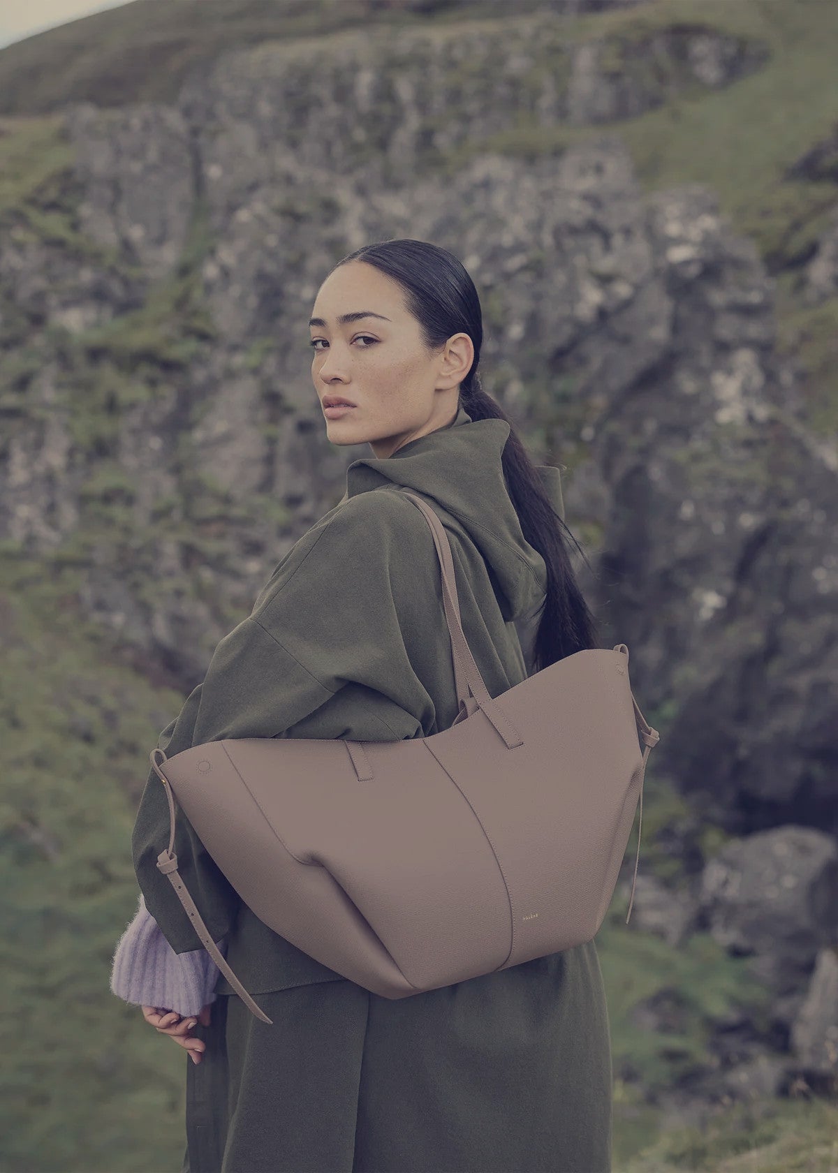 Leathers selected by Polène are sourced from certified European tanneries and require minimal maintenance. A few steps can be taken to maintain the original appearance. Avoid prolonged exposure to direct light or heat, and keep away from water, greasy substances, perfumes, and cosmetics. Use caution with dark or new clothing, as the dye may bleed.
