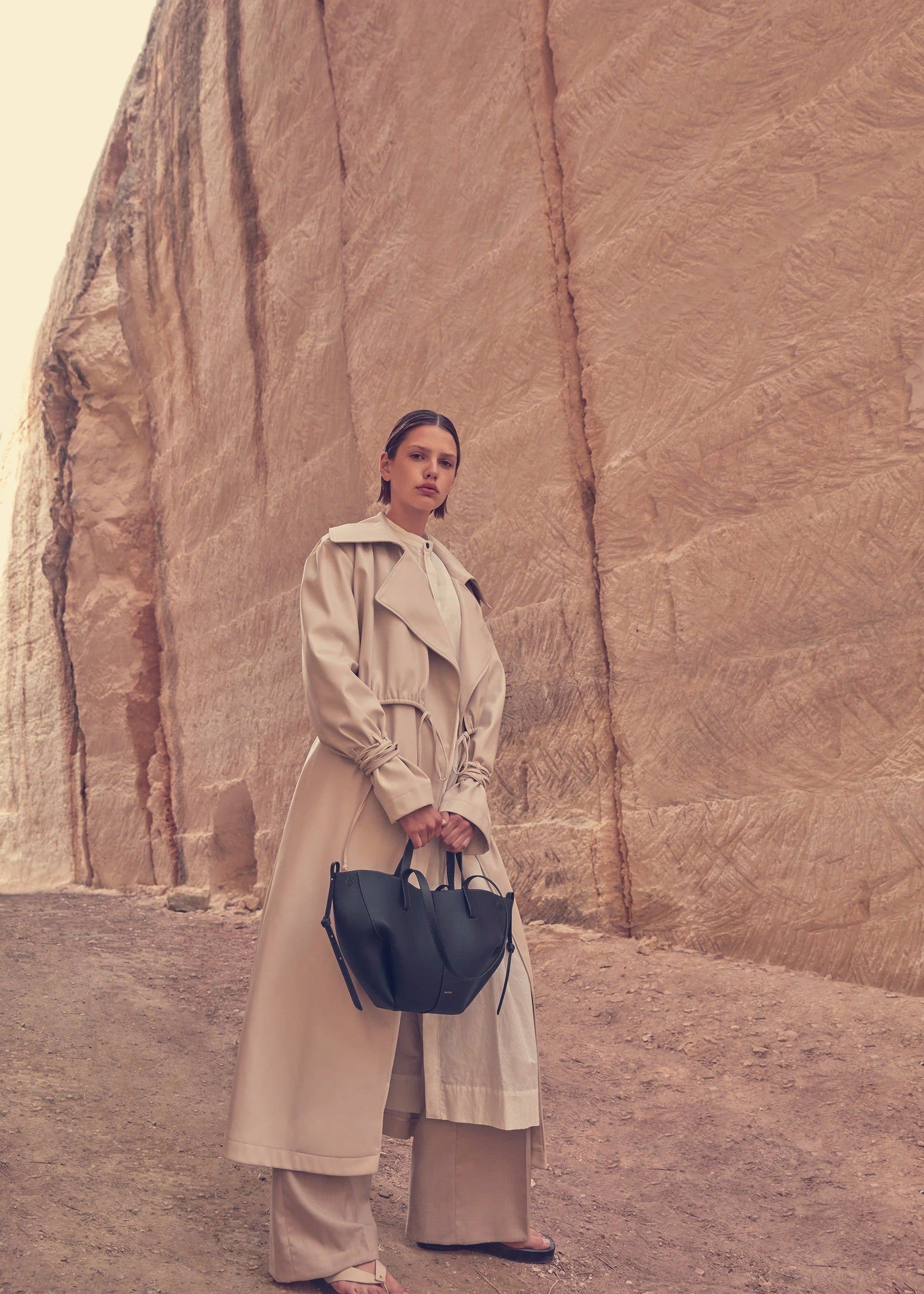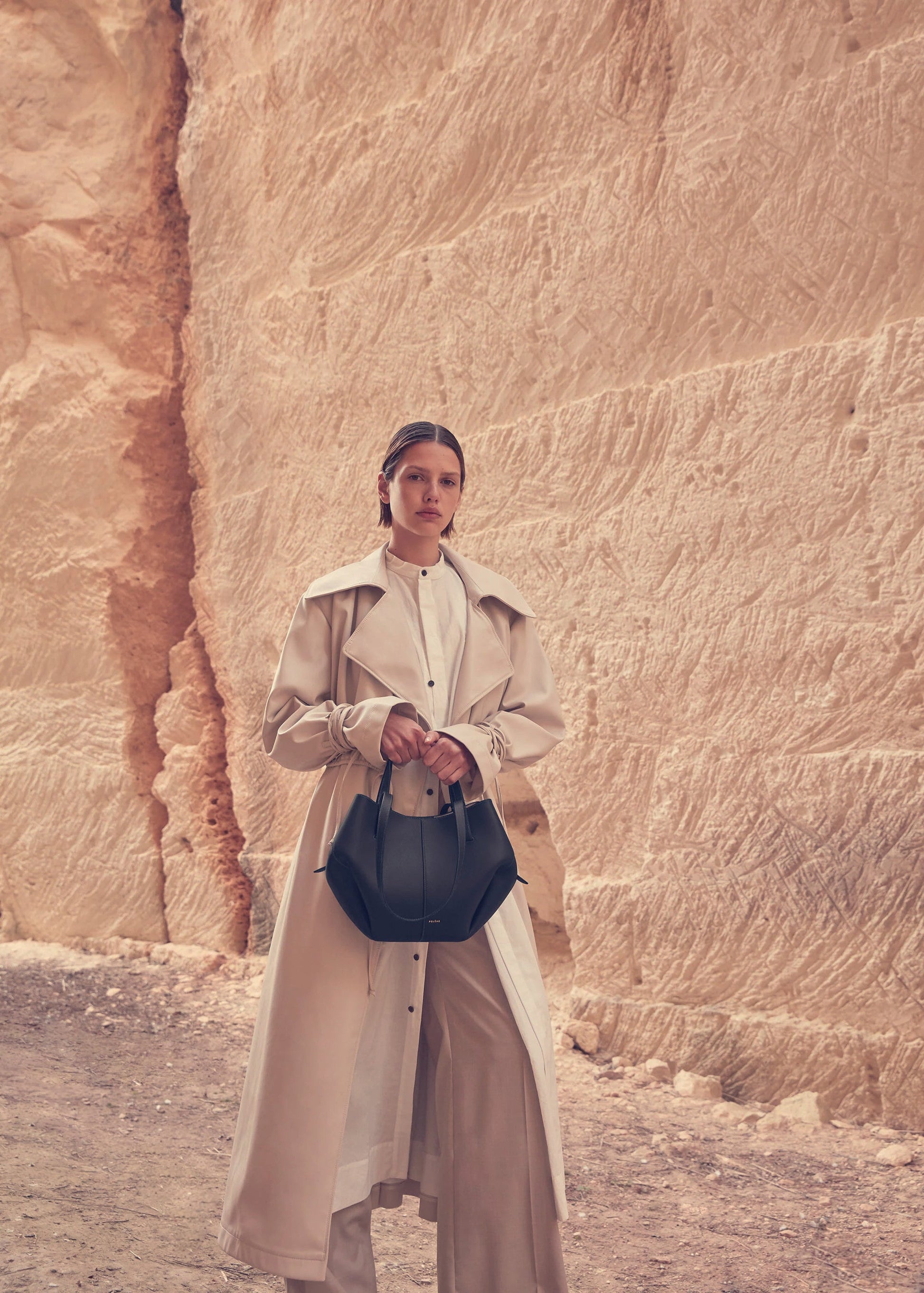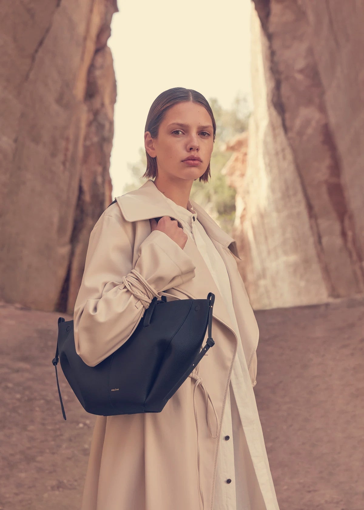 Leathers selected by Polène are sourced from certified European tanneries and require minimal maintenance. A few steps can be taken to maintain the original appearance. Avoid prolonged exposure to direct light or heat, and keep away from water, greasy substances, perfumes, and cosmetics. Use caution with dark or new clothing, as the dye may bleed.