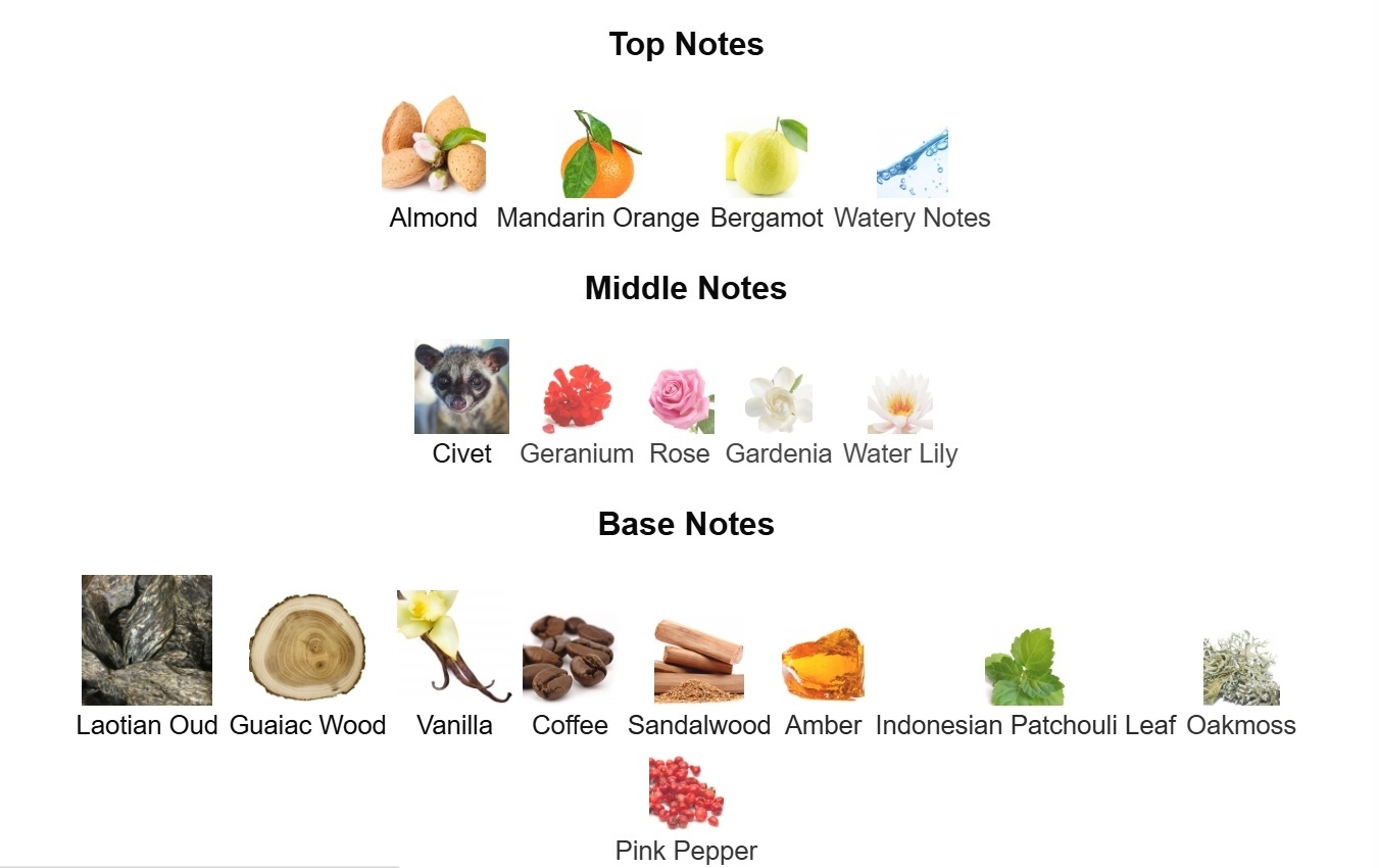 Base Notes: Guaiac, Laos Agarwood, Indonesian Patchouli, Amber, Moss