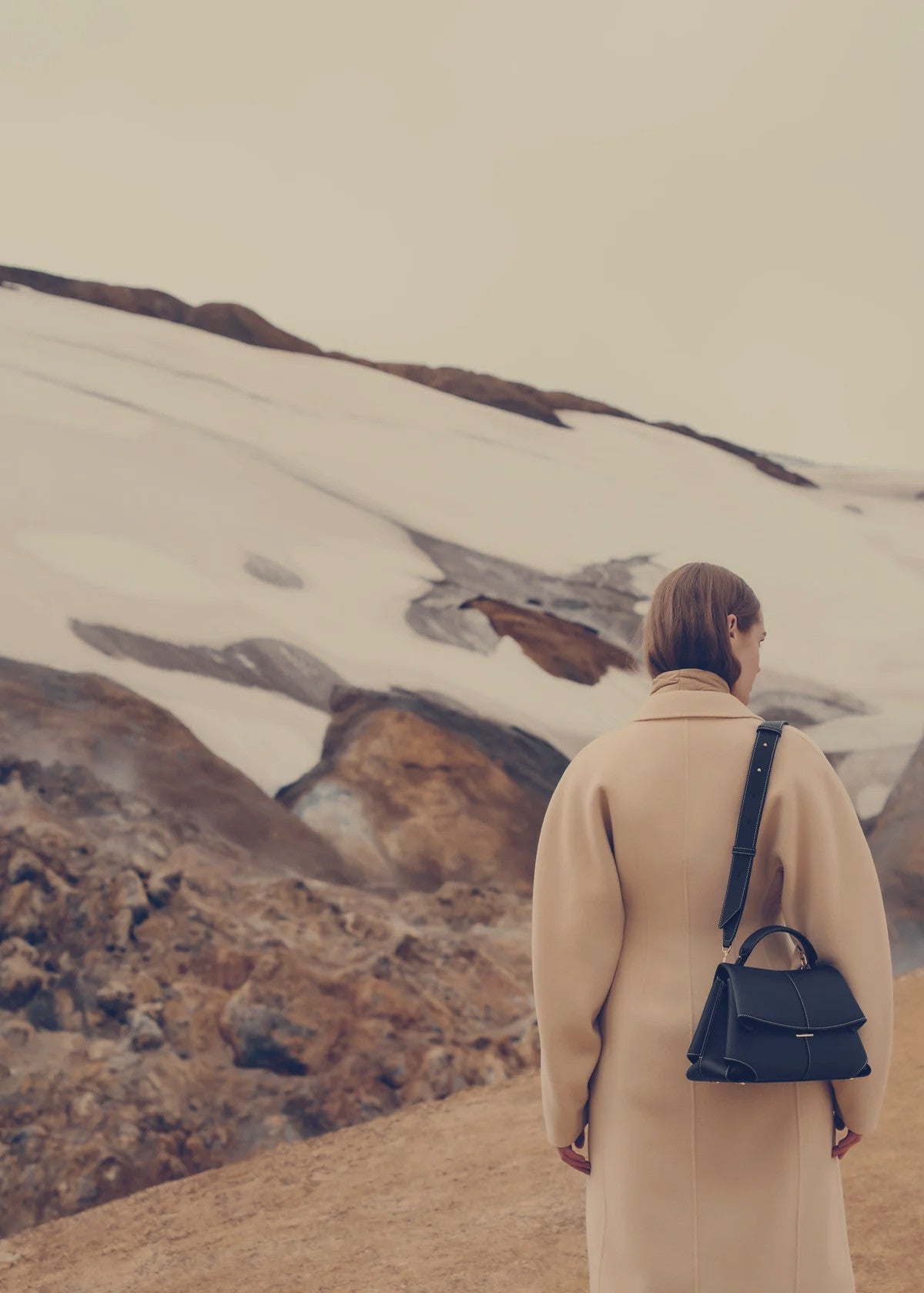 The "Mokki" model showcases the art of folding with its textured leather. The corners are cut to reveal smooth leather for a subtle interplay of textures. The bag’s interior is roomy and divided into compartments, all protected by a flap that features an engraved clasp. With its adjustable shoulder strap held in place by snap hooks, the model smoothly adapts to your movements.