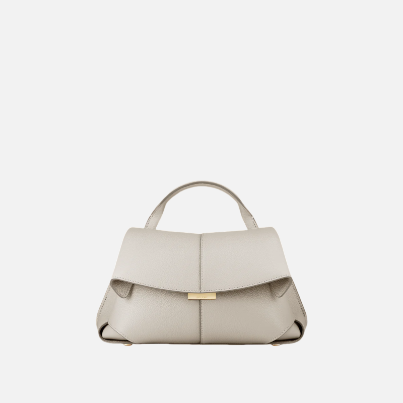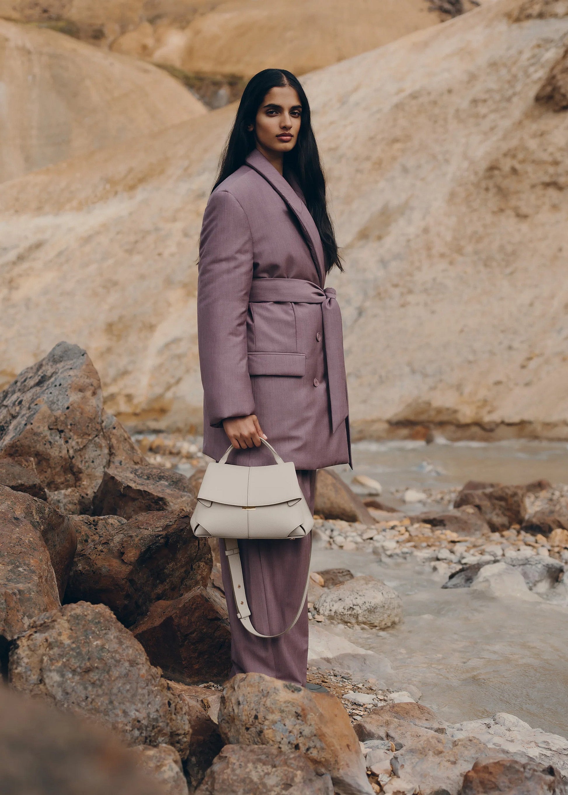 The "Mokki" model showcases the art of folding with its textured leather. The corners are cut to reveal smooth leather for a subtle interplay of textures. The bag’s interior is roomy and divided into compartments, all protected by a flap that features an engraved clasp. With its adjustable shoulder strap held in place by snap hooks, the model smoothly adapts to your movements.