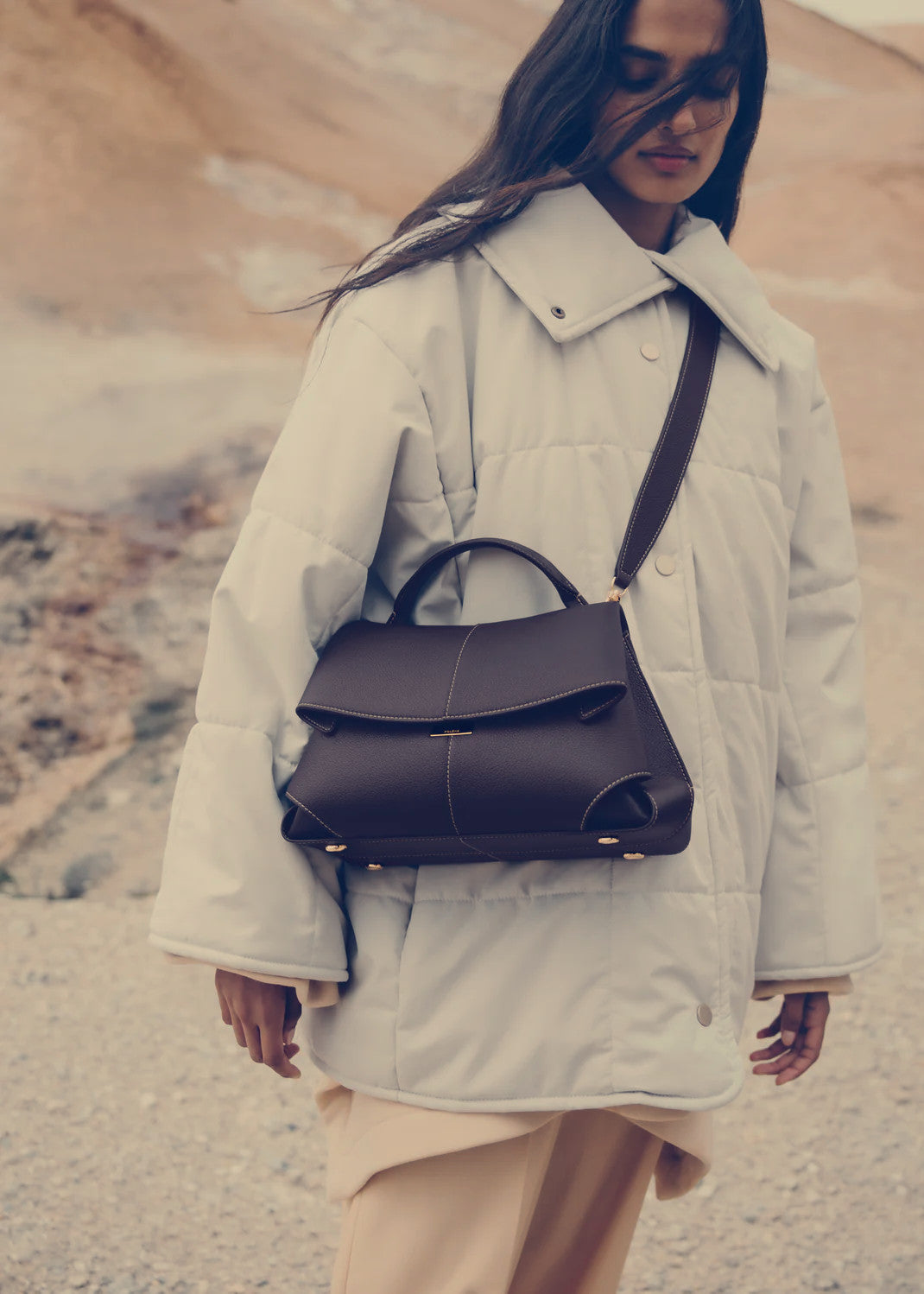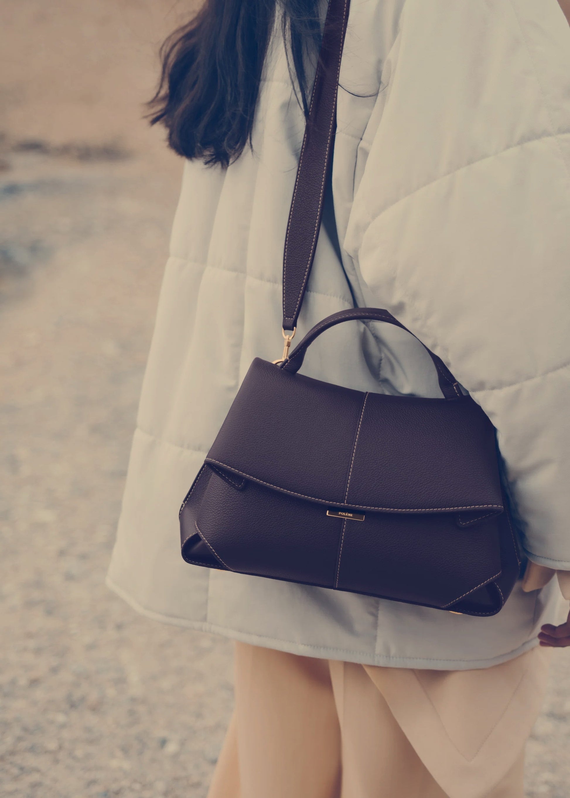 - Polène branded clasp and organically designed bottom studs bearing the Polène logo.