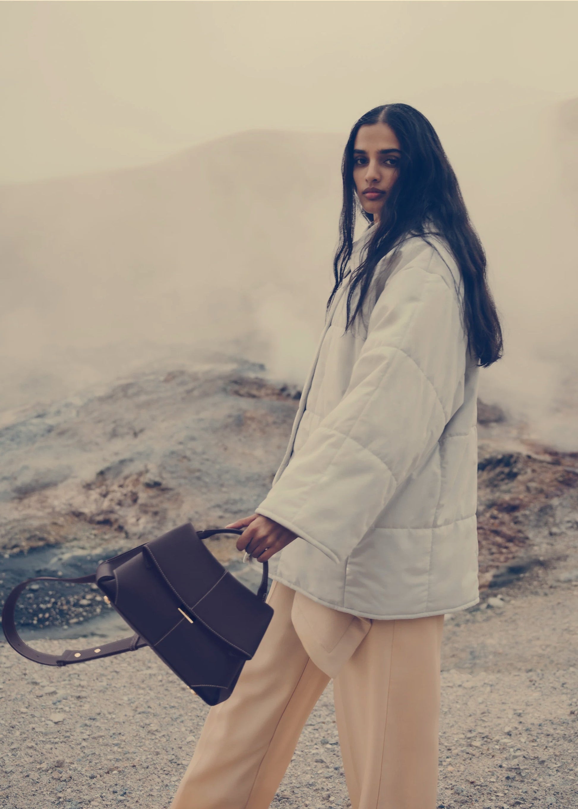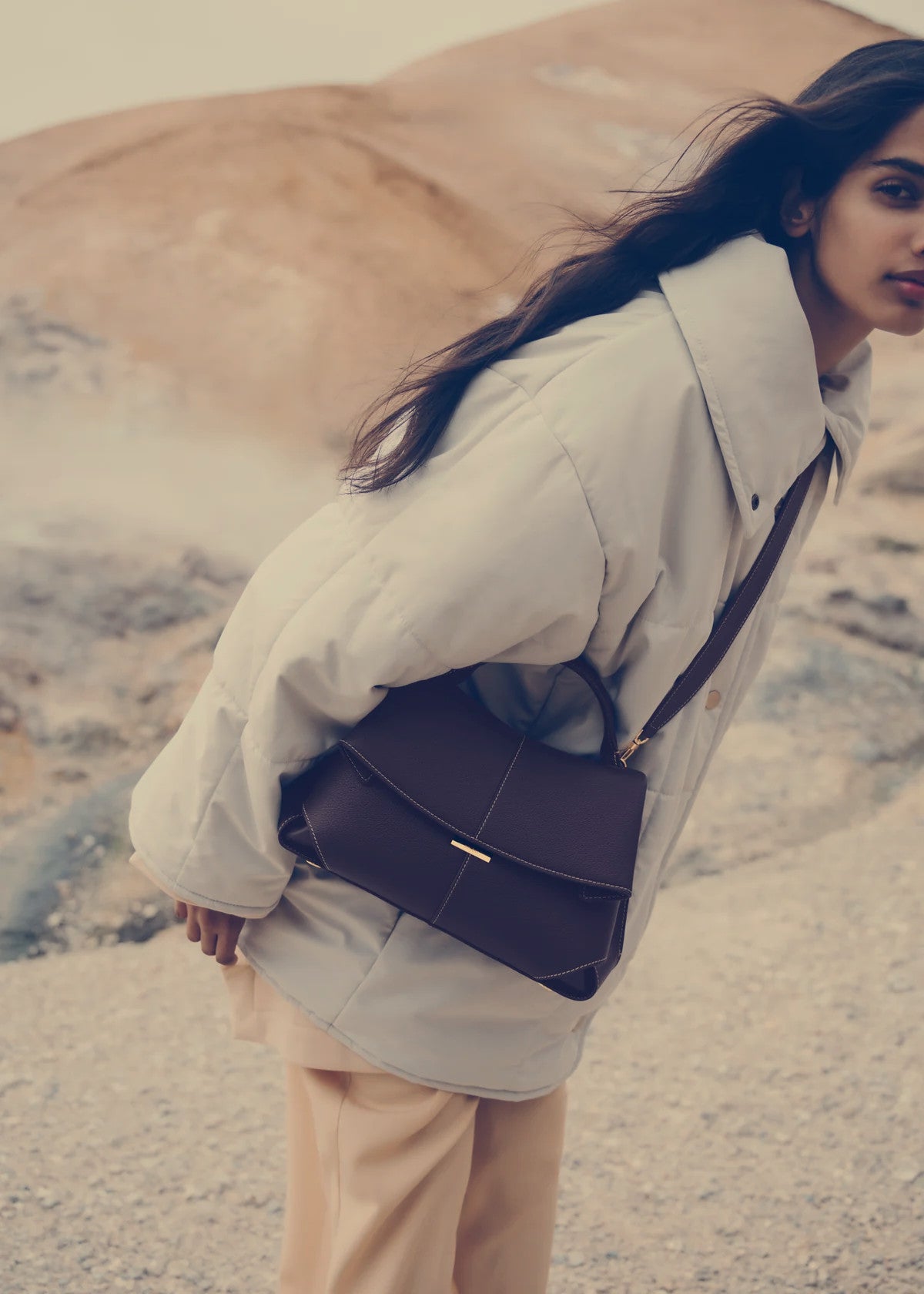 The "Mokki" model showcases the art of folding with its textured leather. The corners are cut to reveal smooth leather for a subtle interplay of textures. The bag’s interior is roomy and divided into compartments, all protected by a flap that features an engraved clasp. With its adjustable shoulder strap held in place by snap hooks, the model smoothly adapts to your movements.