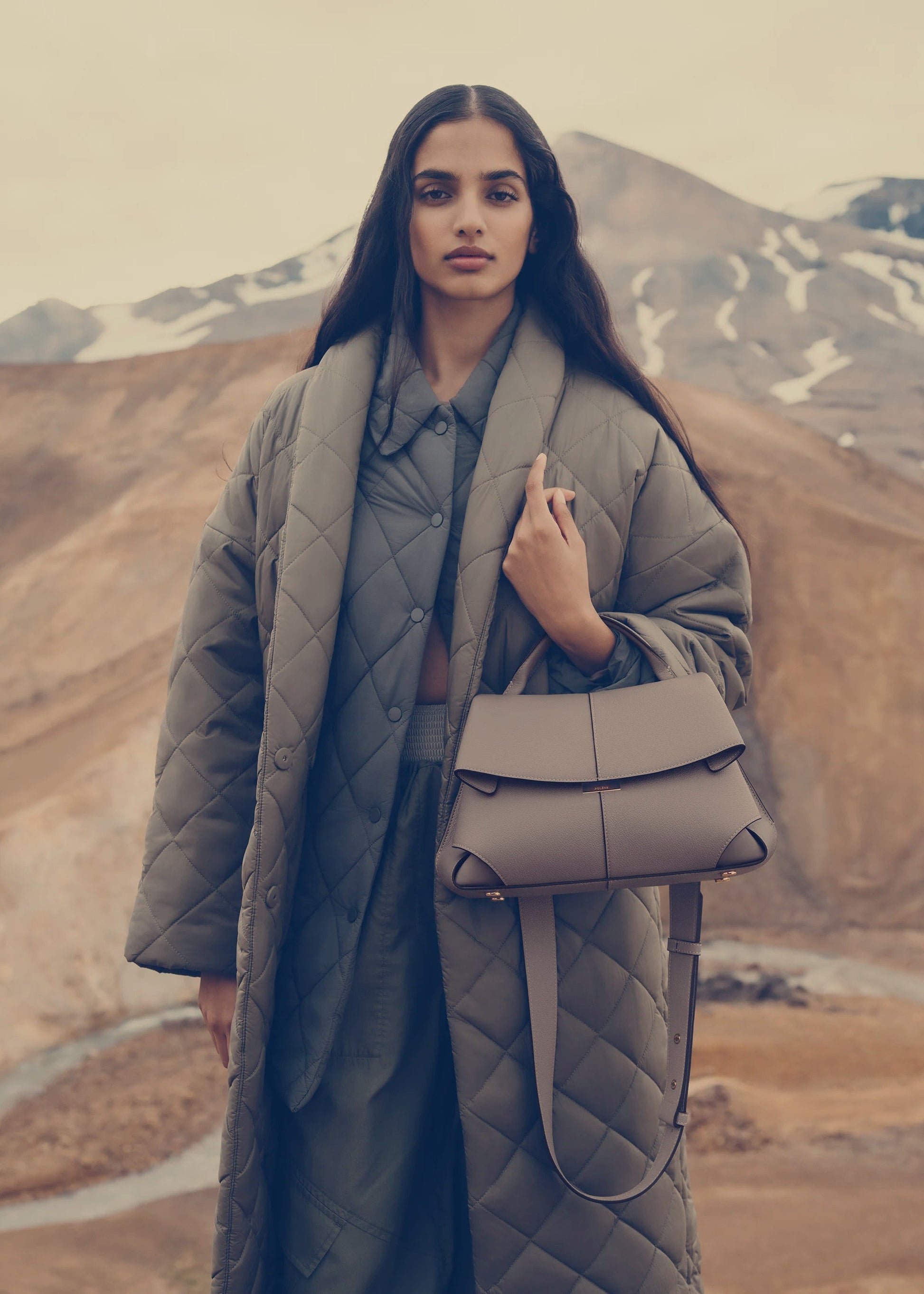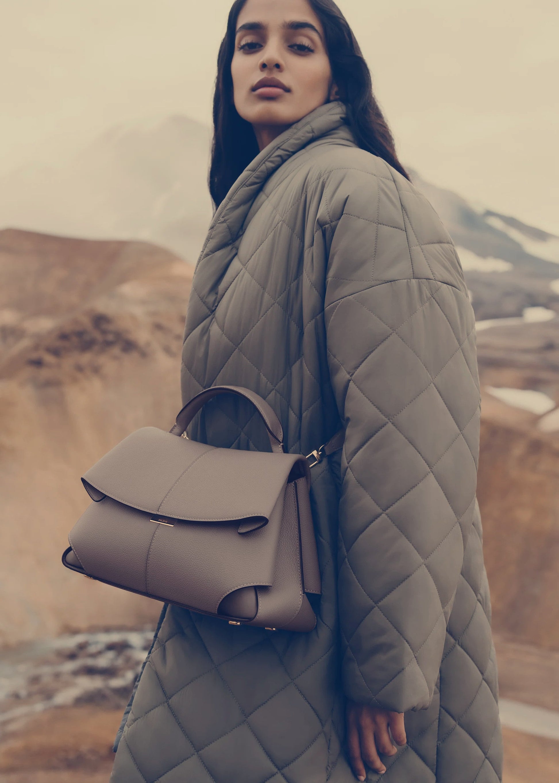 - Polène branded clasp and organically designed bottom studs bearing the Polène logo.