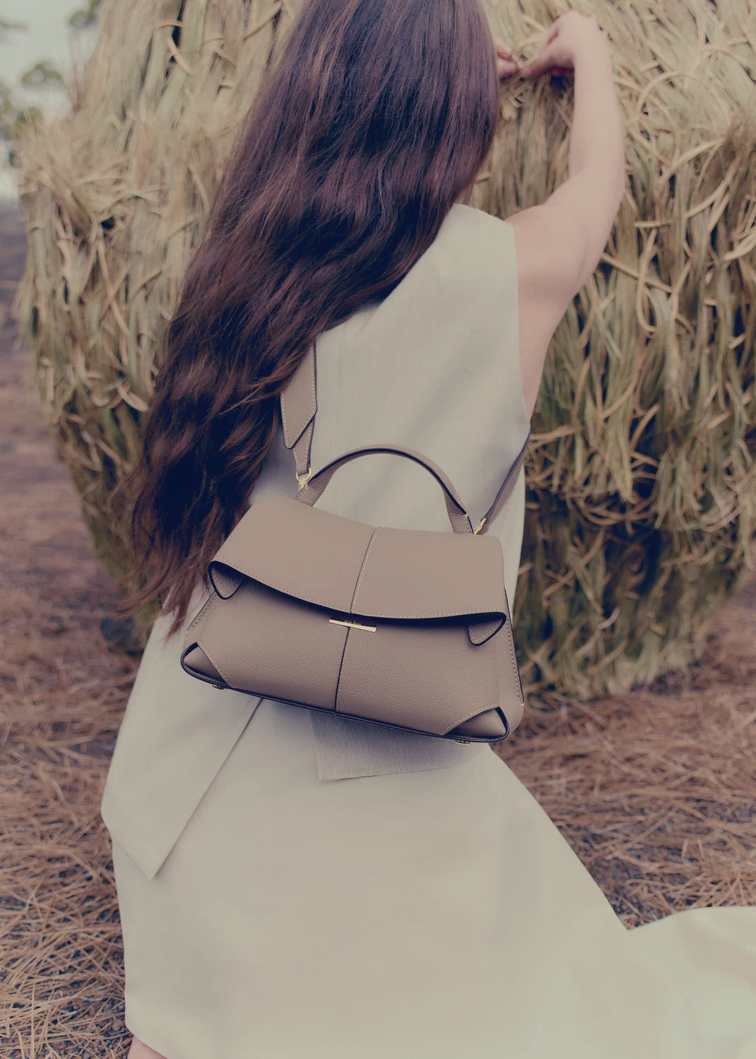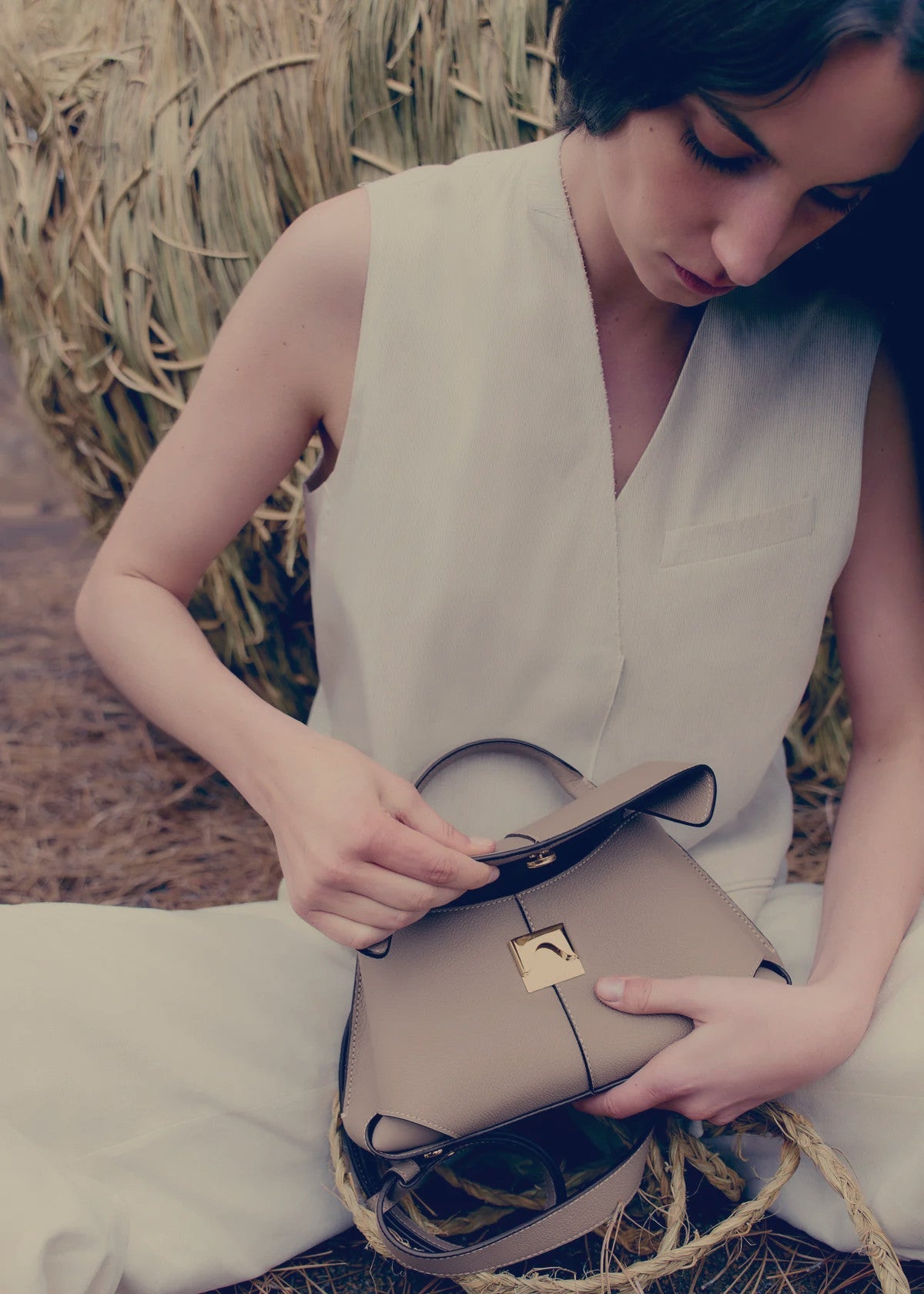 Ingeniously constructed from thirty-six leather panels, the “Mokki Mini” model celebrates the art of folding through a subtle interplay of textured and smooth leathers. The bag’s interior is divided into compartments, all protected by a flap that features an engraved clasp. With its adjustable shoulder strap held in place by snap hooks, the model smoothly adapts to your movements.