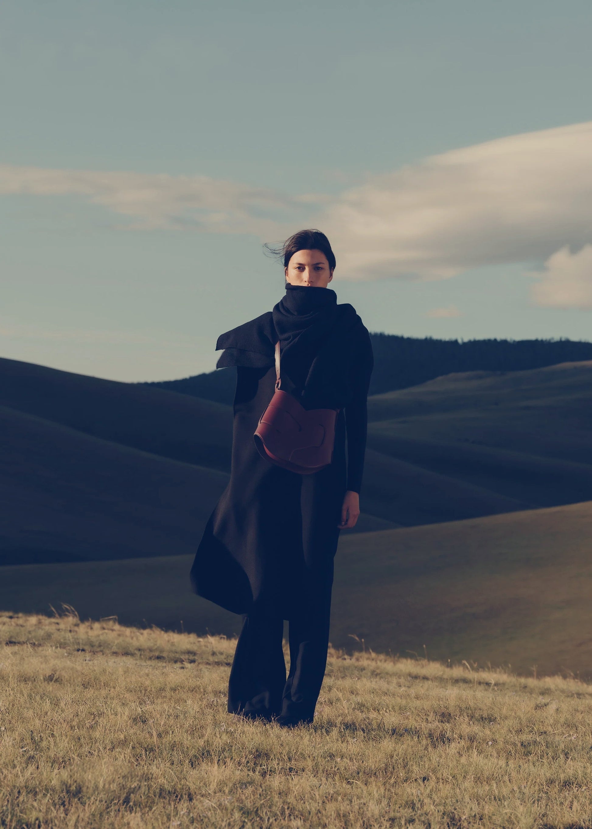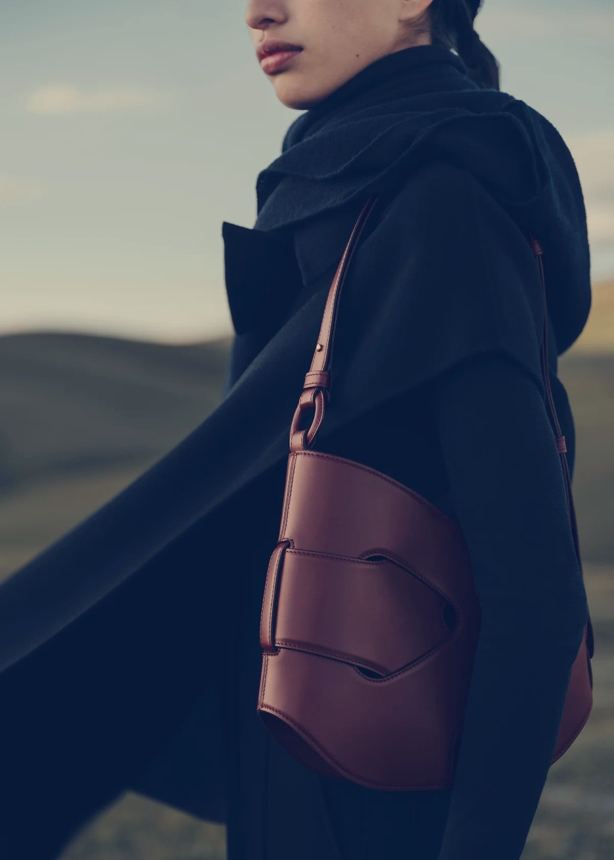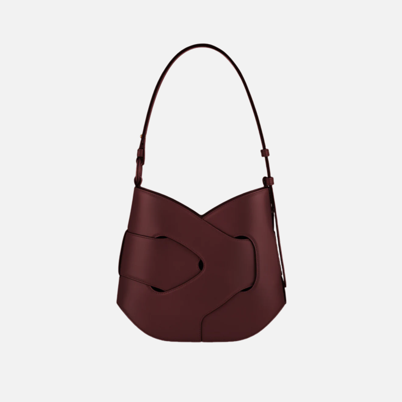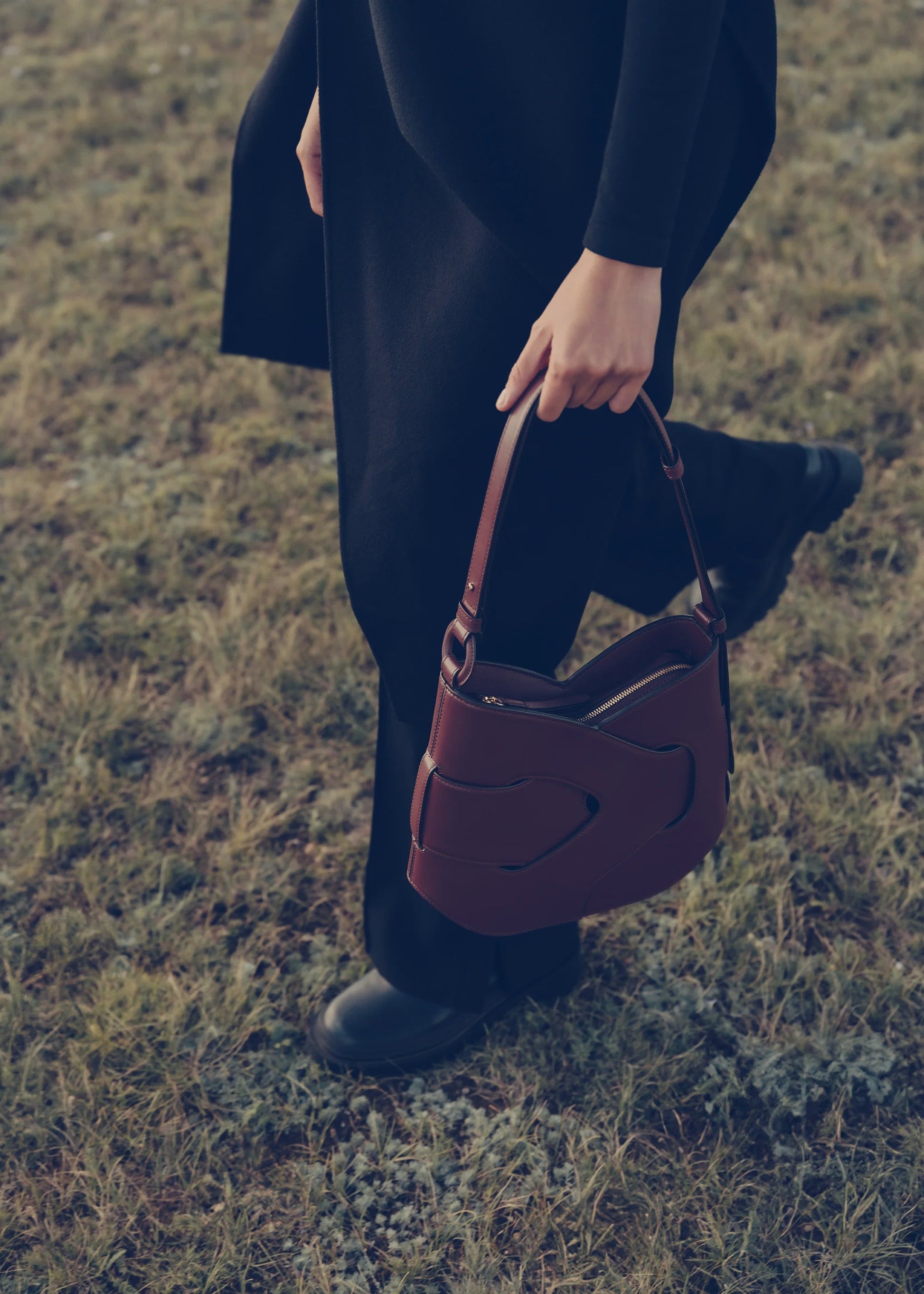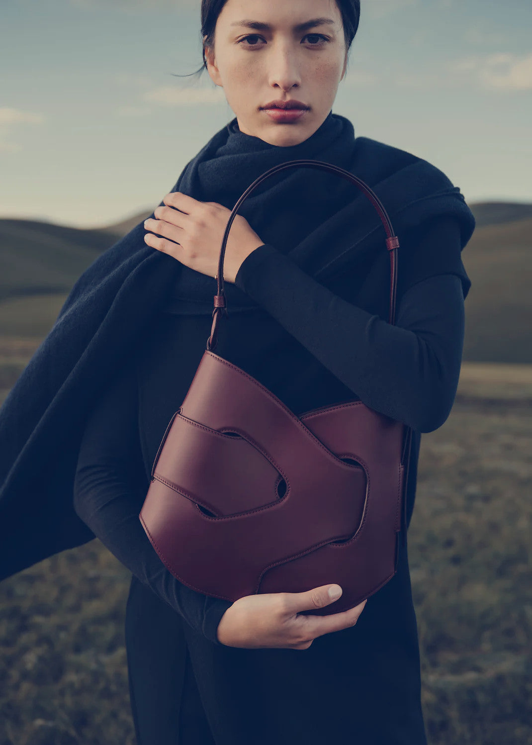 The “Nodde Hobo,” whose name echoes the French word for “knot,” is made up of two perfectly symmetrical, intertwined leather modules. Its beveled design accentuates its dynamic design and its base, set into the main body of the bag using a distinctive assembly technique.