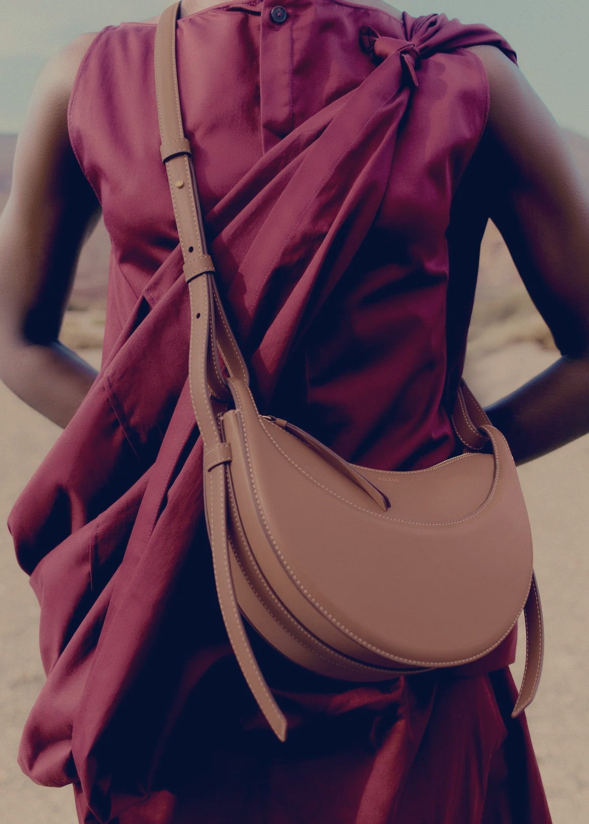 With its rounded shape, foam padding, and hand-stitching, the “Numéro Dix” is a nod to the equestrian codes of saddlery. Its half-moon design highlights juxtaposing curves.