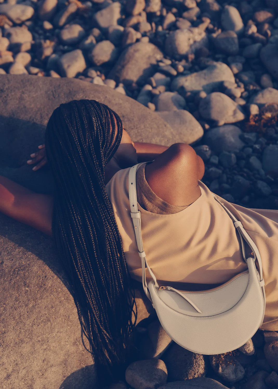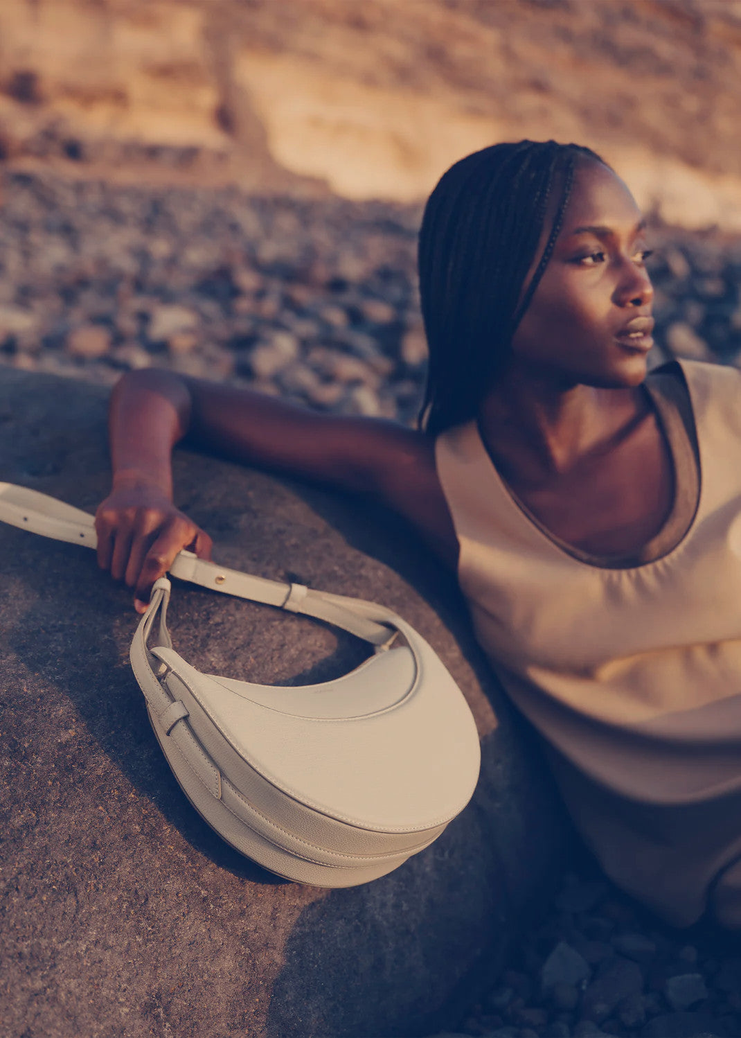 With its rounded shape, foam padding, and hand-stitching, the “Numéro Dix” is a nod to the equestrian codes of saddlery. Its half-moon design highlights juxtaposing curves