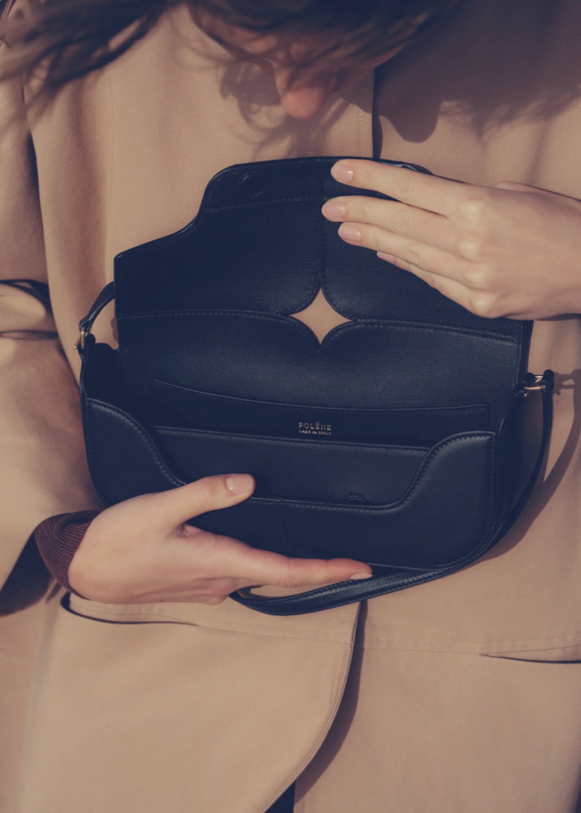 - Adjustable shoulder strap that can be worn short on the shoulder, featuring an engraved Polène buckle.