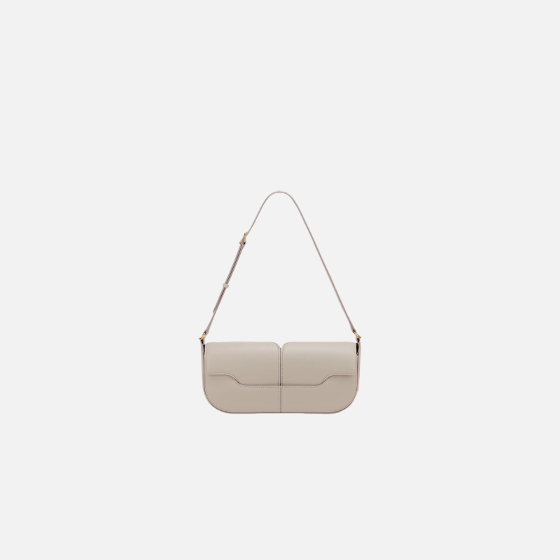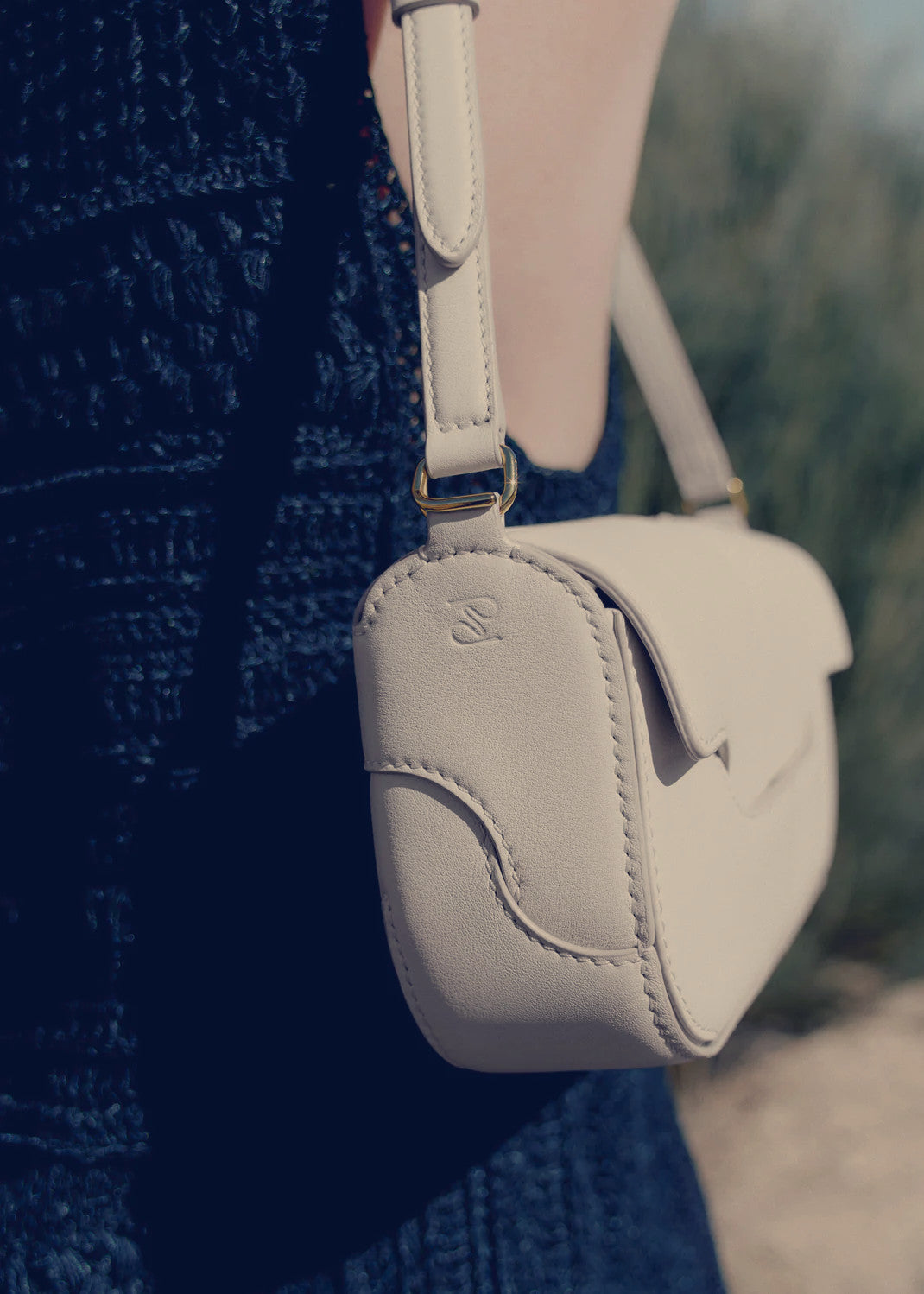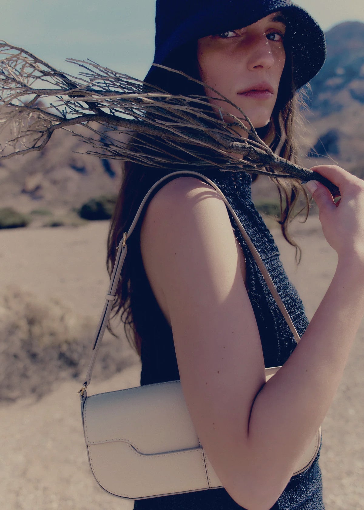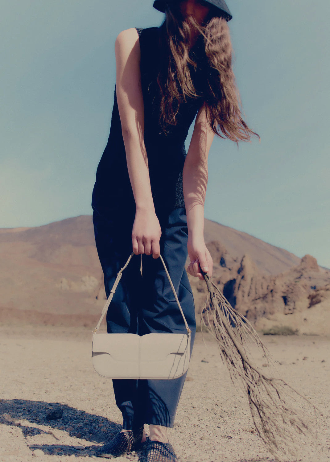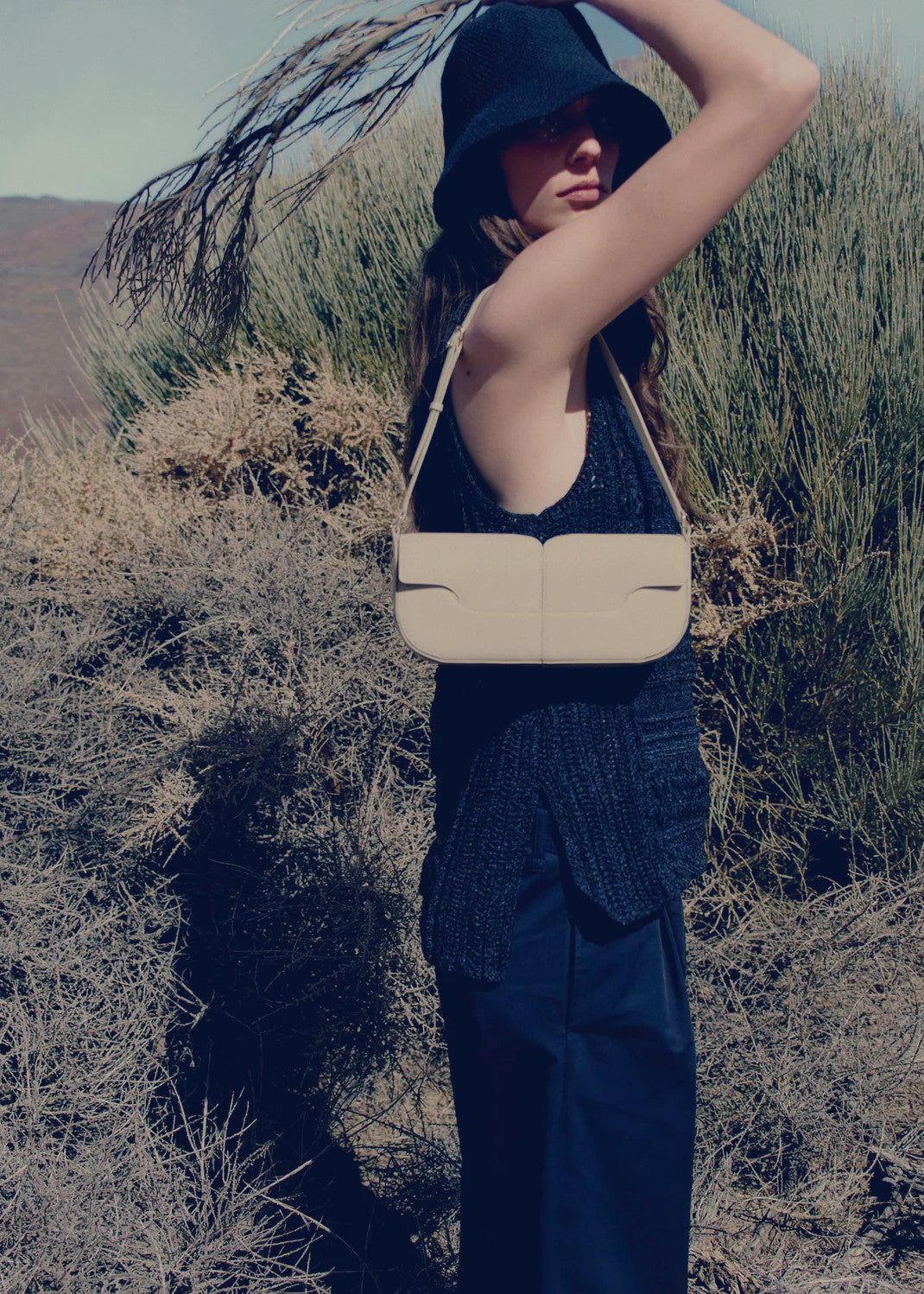 - Adjustable shoulder strap that can be worn short on the shoulder, featuring an engraved Polène buckle.