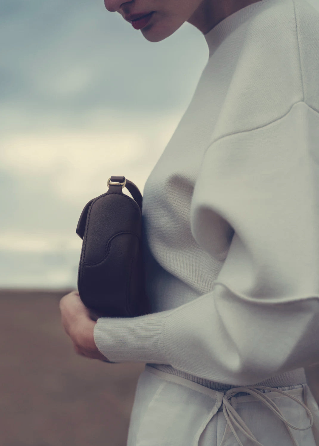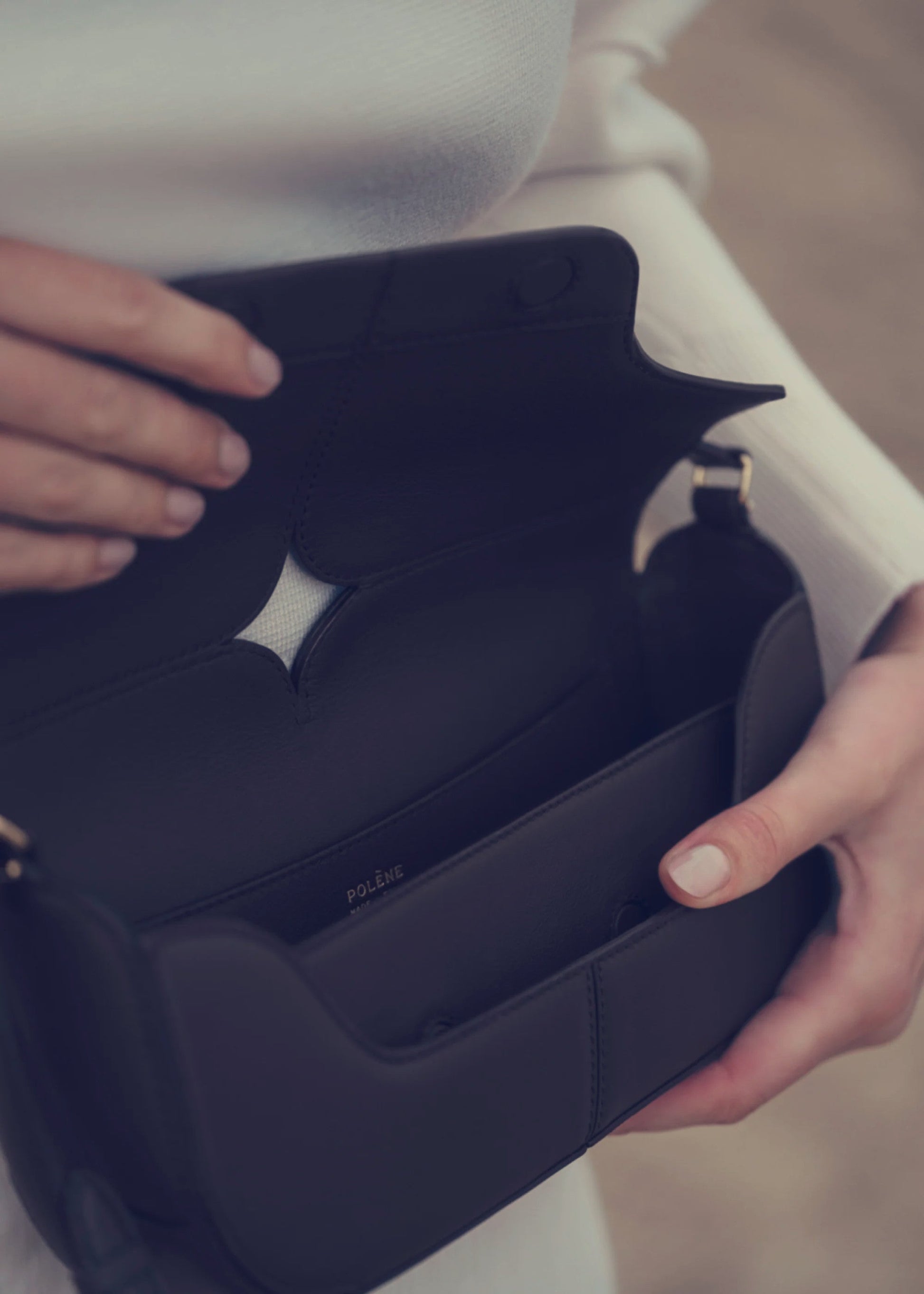 - Adjustable shoulder strap that can be worn short on the shoulder, featuring an engraved Polène buckle.